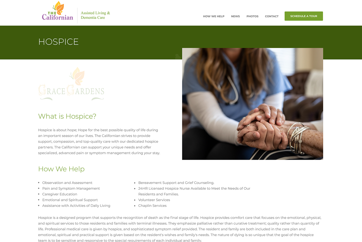 web design showcases their assisted living, memory care, hospice, and respite care services in a warm, welcoming environment.